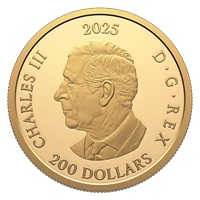 Set against a gold-plated field, the reverse design by artist Trevor Tennant features a close-up view of the elk or wapiti (Cervus canadensis), standing along a river in its forest habitat (seen in the gold-plated background). In order to convey its size, the mature bull (male) is positioned on the outer portion next to the words “CANADA” and “2025”, its tall antlers extending past the framed centre. The obverse features the effigy of His Majesty King Charles III by Canadian artist Steven Rosati.