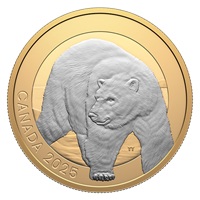 The reverse design by artist Trevor Tennant features an engraved portrait of the polar bear (Ursus maritimus), surrounded by yellow gold plating. Moving across the snow-covered ice that lies at the sea’s edge, the polar bear looks off to the side as it steps out of the central portion of the design, placing its forepaws onto the outer portion where “CANADA” and “2025” are engraved. The obverse features the gold-plated effigy of His Majesty King Charles III by Canadian artist Steven Rosati.