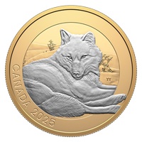The reverse design by artist Trevor Tennant features the grey wolf (Canis lupus) presented in a tranquil, subdued pose. Resting in a wintry Ontario landscape and surrounded by yellow gold plating, the wolf extends its forepaws onto the outer portion where “CANADA” and “2025” are engraved. The obverse features the gold-plated effigy of His Majesty King Charles III by Canadian artist Steven Rosati.