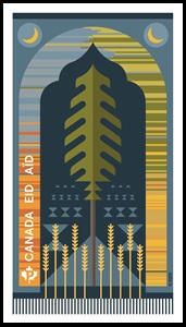 The front of the Official First Day Cover features a photograph of the original handwoven Canadian Prayer Rug and some of the tools and materials that would have been used to make it: a spool, shuttles, a raddle and balls of yarn. The cover also includes the text “Eid/Aïd” and the Eid stamp, cancelled in Edmonton, Alberta – home of the Canadian Prayer Rug. The cancel mark features stalks of wheat reminiscent of the ones that appear on the Canadian Prayer Rug. The back of the Official First Day Cover features a short text on the stamp subject, along with credits and captions. The stamp was cancelled on March 3, a few weeks ahead of Eid -al-Fitr, which takes place in March in 2025. Stamp Designer: Kristine Do; Stamp Illustrator: Kit Craven; Quantity Produced 4,500; Issue Date: March 10, 2025.