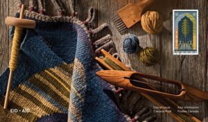 About the design … The booklet cover and the inside and back of the booklet feature photographs of the original, handwoven Canadian Prayer Rug. The inside and back include images of some of the tools and materials that would have been used to create it. On the inside (left to right) are a spool and hanks of yarn; bowls of logwood and black tea, red oak and willow leaves, and bark (used as dyes); and a weaving raddle. On the back are another raddle and shuttle, as well as a spool. Also featured are a short text on the stamp subject, and credit and caption information. Stamp Designer: Kristine Do; Stamp Illustrator: Kit Craven; Quantity Produced: 55,000 booklets of 6 Permanent™ stamps; Cancellation Site: Edmonton, Alberta. Issue Date: March 10, 2025.