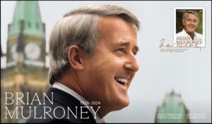 Official First Day Cover cancelled in Baie-Comeau, Quebec, his birthplace, pays tribute to The Right Honourable Brian Mulroney (1939-2024), Canada’s 18th prime minister. Serving from 1984 to 1993, Brian Mulroney led transformative economic, environmental and political initiatives. Canada Post has a longstanding tradition of commemorating former prime ministers through the annual commemorative Canada Post stamp program. Stamp Designer: Paprika; Quantity Produced: 7,000; Issue Date: March 21, 2025.