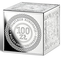 The reverse of the silver coin with a face value of 100 zł features the face value and the inscription “THE MILLENNIUM OF THE CORONATION OF BOLESŁAW THE CHROBRY”. The obverse features the inscription “Rzeczpospolita Polska”, the year of issue and the image of the eagle established as the emblem of the Republic of Poland. Stylized scenes from selected sections of the Gniezno Doors are presented on three sides of the coin: section XVI – the redemption of the body of St. Adalbert from the Prussians by Bolesław the Brave, section XVII – the transfer of St. Adalbert’s body, section XVIII – the burial of the saint’s remains in Gniezno. The main side of the coin features the image of Bolesław the Brave according to an 18th-century medal by medalist Jan Filip Holzhaeusser.