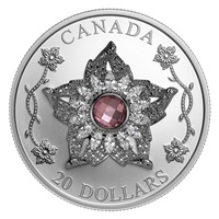 Face Value: $20 … Composition: 99.99% pure silver adorned with crystals and a coloured glass stone on a rhodium plated setting; Mintage: 6,000; Weight: 31.39 g; Diameter: 38 mm; Edge: Serrated; Finish: Matte Proof; Artist: Mint Engravers (reverse), Steven Rosati (obverse); Packaging: Black clamshell with black beauty box.