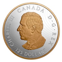 The reverse design by artist Anna Bucciarelli features a circular arrangement of current and historical effigies, one for each reigning monarch whose likeness has graced Canada’s coins since Confederation (from top, counter-clockwise): the effigy of Queen Victoria (1870-1901) by L. C. Wyon; the effigy of King Edward VII (1902-1910) by G. W. De Saulles; the effigy of King George V (1911-1936) by Sir E. B. Mackennal; the effigy of King George VI (1937-1952) by T. H. Paget; the effigy of Queen Elizabeth II (1953-1964) by Mary Gillick; and the effigy of His Majesty King Charles III (2023-present) by Steven Rosati. This collection of royal portraits is surrounded by the emblems of the United Kingdom (Tudor rose, shamrock, thistle and daffodil) and Canada (maple leaf), and elegantly bordered by flourishes of acanthus leaves. The obverse features the effigy of His Majesty King Charles III by Canadian artist Steven Rosati.