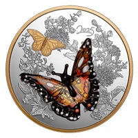 Enhanced with selective gold plating, the reverse design is an engraved rendition of an original water colour painting by Canadian artist Caren Heine. It features two monarch butterflies — an engraved one, and a handblown Murano glass butterfly crafted by master glassmaker Vio Col Vetro in Murano, Italy. The engraved botanical-themed backdrop focuses on the monarch’s host plant, milkweed, its leaves, flowers and seed pods mixing with spikes of delphinium flowers to form an enticing environment for these important pollinators. The obverse features the effigy of His Majesty King Charles III by Canadian artist Steven Rosati.