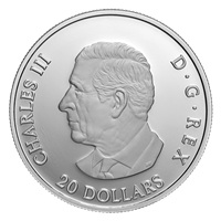 Engraved in Ultra High Relief (UHR), the reverse design by artist Emily Damstra brings the viewer face-to-face with the grey wolf (Canis lupus) in the Canadian wilderness. The wolf in the foreground leads the chase and is trailed by other members of the pack as it moves swiftly across the rocky forest terrain, even making a hairpin turn while closing in on its fleeing prey. The obverse features the effigy of His Majesty King Charles III by Canadian artist Steven Rosati.