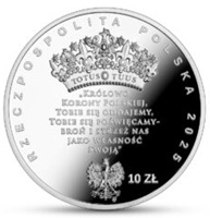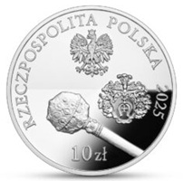 Front side (obverse): at the top, an image of Virgin Mary’s crown from the painting of Our Lady of Jasna Góra, donated by Saint John Paul II; below it, the following text: “KRÓLOWO / KORONY POLSKIEJ, / TOBIE SIĘ ODDAJEMY, / TOBIE SIĘ POŚWIĘCAMY – / BROŃ I STRZEŻ NAS / JAKO WŁASNOŚĆ / SWOJĄ” (Queen of the Polish Crown, we surrender ourselves to you, we commit ourselves to you – defend and protect us as your property); at the bottom, the image of the Eagle established as the state emblem of the Republic of Poland; below the Eagle, on the right, the Mint mark: m / w, and to the right of the Eagle, the inscription: 10 ZŁ. Along the rim, from the left to the top, the inscription: RZECZPOSPOLITA POLSKA (Republic of Poland) 2025.