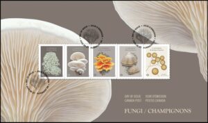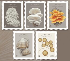 About Fungi … Growing awareness of the importance of biodiversity and traditional Indigenous knowledge has renewed our fascination with fungi and lichens. While the world’s fungal diversity is vast, only a small percentage of fungal species has been catalogued. The five species presented in this stamp issue are all found in Canada: