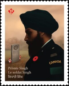 Private Singh: Official First Day Cover … The OFDC – issued on November 3 – in advance of Remembrance Day – honours the courage and sacrifice of the Sikh soldiers who have served in the Canadian military since the First World War. The stamp is cancelled in Kitchener, Ontario, home of the Mount Hope Cemetery, where Private Buckham Singh is buried. The front of the OFDC features a photograph of (l-r) Sergeant Gurpreet Singh Dipak, Captain Daulat Singh Deol and Sergeant Manpreet Singh at the Sikh Remembrance Day Ceremony in Kitchener, Ontario, 2013 (photo: SikhMuseum.com). The back of the OFDC features a photograph of the Victory Medal awarded to Private Buckam Singh in 1919 (photo courtesy of SikhMuseum.com). The Poppy Design is a registered trademark of The Royal Canadian Legion, Dominion Command, and is used under licence. Stamp Designer: Larry Burke and Anna Stredulinsky, Burke & Burke; Stamp Illustrator: Parm Singh; headstone illustration (based on photo), Dave Peleschak; Issue Date: November 3, 2025.