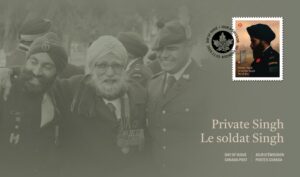 The Private Singh stamp – issued on November 3 – in advance of Remembrance Day – honours the courage and sacrifice of the Sikh soldiers who have served in the Canadian military since the First World War. The Private Singh issue is available in multiple formats: ***Booklet of six Permanent™ domestic rate stamps. ***Private Singh: Official First Day Cover. ***Pane of 5 Permanent™ domestic rate stamps. ***Permanent™ domestic rate is always accepted at the current domestic postage price.