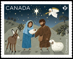 About the design … The stamp features a simple rendition of the Nativity scene – including Mary and Joseph with baby Jesus – set beneath the bright shining star of Bethlehem and an angel announcing the birth of Jesus. The Three Wise Men are seen arriving in the distance. This warm and whimsical depiction of the Nativity features a subtle use of colour and shading. Stamp Designer: Sputnik Design Partners Inc.; Stamp Illustrator: Bex Morley; Quantity Produced: 250,000 booklets of 12 Permanent™ stamps; Issue Date: November 6, 2025.