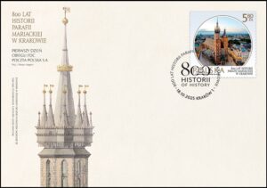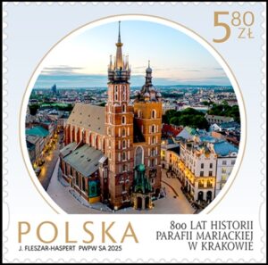 Issue date: 18-10-2025  … To celebrate the 800th anniversary of the Mariacka Parish in Kraków, Poczta Polska issued a commemorative philatelic sheet that honors one of Poland’s most iconic churches — St. Mary’s Basilica. Located on Kraków’s Main Market Square, the basilica dates back to the 13th century and took its current Gothic form in the 14th century. It is renowned for the monumental altar by Veit Stoss, Gothic architecture, polychromes by Jan Matejko, and the tradition of the Mariacki bugle call, played hourly from the basilica’s tower.