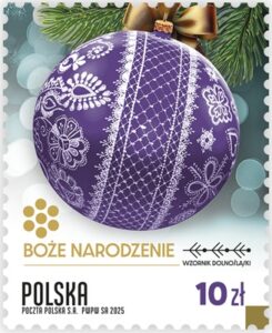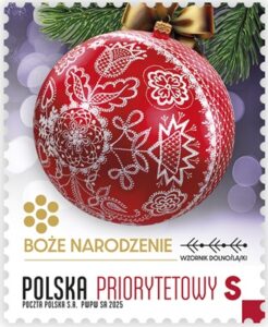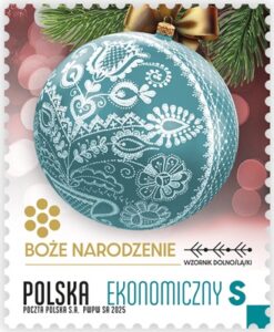 Data emisji: 05-11-2025  (PR format S) … Poczta Polska wprowadziła do obiegu emisję znaczków pocztowych „Boże Narodzenie”, inspirowaną unikatowym Wzornikiem Dolnośląskim – współczesnym regionalnym motywem dekoracyjnym, który łączy tradycję z nowoczesnością. Na znaczkach przedstawiono zdjęcia bombek choinkowych zdobionych wzorami zaczerpniętymi z dolnośląskiego dziedzictwa kulturowego. Pod wizerunkiem bombek widnieje tytuł emisji „Boże Narodzenie” oraz napis „Wzornik Dolnośląski”. Wzdłuż dolnej krawędzi umieszczono napis „POLSKA” i odpowiednie oznaczenie wartości: EKONOMICZNY S, PRIORYTETOWY S oraz 10 zł.