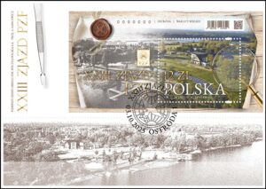 The souvenir sheet and FDC envelope include additional elements that emphasize the character of the event and the passion for philately: *** A magnifying glass enlarging part of the landscape – symbolizing the curiosity and precision of philatelists. *** Tweezers – a collector’s essential tool, placed next to the vertical inscription “XXIII ZJAZD PZF”. *** A wax seal with the PZF symbol – referencing the tradition and elegance of correspondence. *** A postmark dated 03.10.2025 with the PZF symbol and the town name Ostróda – confirming the date and place of the issue and the congress The entire composition not only documents the event but also reflects the spirit of philately – combining nature, history, and the passion for collecting.