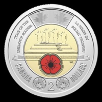 Saluting the one who represents the many. Few symbols are more sacred than the Tomb of the Unknown Soldier, and none more eloquently express the enduring consequences of war. The Unknown Soldier’s tomb is hallowed ground, and, every November 11, it becomes one of the focal points for our collective remembrance, grief and gratitude for Canada’s service members past, present, and future. Designed by Mary-Ann Liu, sculptor of the tomb’s bronze relief, the 2025 $2 Honouring Canada’s Unknown Soldier Commemorative Circulation Coin calls all Canadians to remembrance. The 25 coins in each colourized Special Wrap Roll all feature the same view of the Tomb of the Unknown Soldier, backed by silhouettes of four sentries representing all Canadians who serve or have served, and with a red poppy of remembrance. Marked by the poppy of remembrance.
