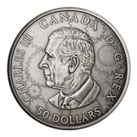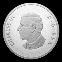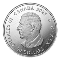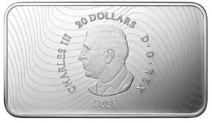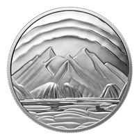 Your coin’s reverse features a carefully sculpted adaptation of Baffin Island Mountains(c. 1931), one of several Arctic canvases by Lawren Stewart Harris, the renowned landscape painter and a founding member of Canada’s famous Group of Seven painters. While Harris’ original oil painting features cool blues, bold browns and varying shades of white, this engraved interpretation uses different frostings and relief heights to re-create the dramatic contrast between the icy peaks and the radiant sky, as well as the rugged rocks and the icy water. The obverse features a wavy pattern and the effigy of His Majesty King Charles III by Canadian artist Steven Rosati.