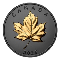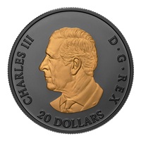 Designed by Canadian artist Donna Kriekle, your coin’s reverse features a gold-plated sugar maple (Acer saccharum) leaf set against the black rhodium plated field and rim. Black rhodium plating also fills the field and rim on the obverse, which features the gold-plated effigy of His Majesty King Charles III by Canadian artist Steven Rosati.
