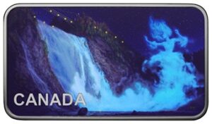 Face Value: $20 … Composition: 99.99% pure silver with colour and black light paint technology; Mintage: 6,500; Weight: 31.56 g; Dimensions: 49.80 mm x 28.60 mm; Edge: Plain; Finish: Proof; Artist: Pandora Young (reverse), Steven Rosati (obverse); Packaging: Black clamshell with black beauty box.