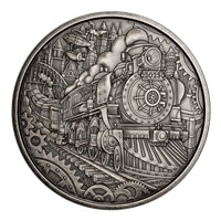 Designed by Canadian artist David Oram, the steampunk-styled reverse invites you to step into a whimsical retro-futuristic world. A stylized steam locomotive charges out of a vintage train station, filling the scene with steam as it pulls cars along the track. Turrets, ornate facades, and towering buildings contribute to the cityscape that rises up in the background, where a steamboat-inspired airship has taken to the skies. In keeping with the industrial-era aesthetic, gears positioned near the edge partially frame the scene, while gear shapes form a pattern on the obverse, which features the effigy of His Majesty King Charles III by Canadian artist Steven Rosati.