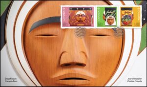 The Official First Day Cover is cancelled on September 29 in Winnipeg, Manitoba, the location of the NCTR, which houses the Bentwood Box. The cancel references both the woodgrain and curves seen in the carvings on the box. Quantity Produced: 7,000;. Issue Date September 29, 2025.