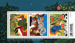 About the design … These stamps feature a fox (Permanent™ domestic rate), squirrels (U.S. rate) and a rabbit (international rate) cheerily decorating their home for the holidays. The issue’s storybook approach feels nostalgic and captures the magical feeling of the holidays. Stamp Designer: Kristine Do; Stamp Illustrator: Alexandra Finkeldey; Quantity Produced: 250,000 sheetlets of 6 international rate stamps; Issue Date: November 6, 2025.