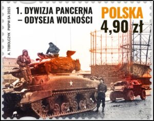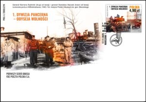 Issue date: 17-11-2025 … A new installment in the philatelic series dedicated to the 1st Armored Division – a unique sheet commemorating the capture of Wilhelmshaven in 1945. Each stamp features a photograph of a Sherman tank from the 1st Armored Division, positioned next to destroyed gas tanks in the port of Wilhelmshaven in 1945. FDC envelope features a photo showing Gen. Klemens Rudnicki (second from the left) and Gen. Stanisław Maczek (third from the left) at the Wilhelmshaven port in 1945.Postmarkis stylized as the badge of the 1st Armored Division commanded by Gen. Maczek, highlighting the unit’s symbolism. The design uses sepia and orange tones, giving the composition a historical and documentary character. In the background, steel structures of the tanks emphasize the industrial nature of the Wilhelmshaven port.