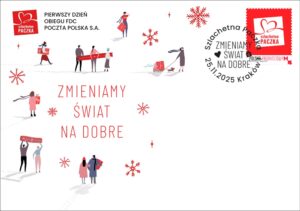 Issue date: 25-11-2025 … The issue by Polish Post features the logo of the “Szlachetna Paczka” charity campaign – a red background with a white heart and the inscription “szlachetna PACZKA”. This unique stamp combines philately with the idea of helping those in need. The issue is complemented by an FDC envelope with a winter-themed design, showing people carrying gifts and the slogan: “We change the world for good”, also included in the postmark graphic. The stamp was created in close cooperation with the WIOSNA Association, organizer of the “Szlachetna Paczka” campaign, which has been changing lives of thousands of families in Poland.