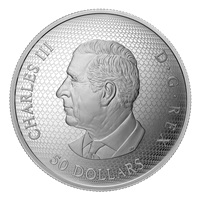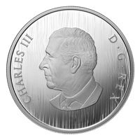 Backed by a woodgrain pattern, the reverse design by Cathy Bursey-Sabourin features a lion depicted in a heraldically stylized manner within a cartouche frame. The lion is presented in a forward-facing pose and engraved in Extraordinarily High Relief (EHR). The surrounding wreath is engraved in Ultra High Relief (UHR) and consists of floral emblems from the Arms of Canada—the Tudor rose of England, the thistle of Scotland, the shamrock of Ireland, the lily of France, and Canada’s maple leaf—along with seed pods, flower buds and maple keys signifying renewal and hope for the future. The woodgrain pattern also appears on the obverse, which features the effigy of His Majesty King Charles III by Canadian artist Steven Rosati.