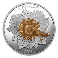 Designed by RCM Engraver Ryan Poser, the coin’s reverse captures the light and colours of a summer day in an open field, where sunflower (g. Helianthus) blooms tower above leaves dotted with raindrops. The 3D flower at the centre has attracted the attention of a seed-eating American goldfinch (Spinus tristis); both are cast in sterling silver and plated with yellow gold, and when the coin is tipped, the motion causes the goldfinch to circle the bloom. The obverse features the effigy of His Majesty King Charles III by Canadian artist Steven Rosati.