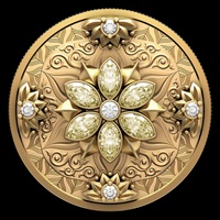 Face Value: $200 … Composition: 99.99% pure gold, with six marquise cut fancy yellow diamonds (min. 1.14 total carat weight);  Mintage: 30; Weight: 31.16 g; Diameter: 30 mm; Edge: Serrated; Finish: Proof; Artist: Simon Ng (reverse), Steven Rosati (obverse). Packaging: Matte black wood case with a removable coin tray that slides into the wood stand for an upright display. Also included: gloves, dusting cloth, two certificates of authenticity and a welcome letter.