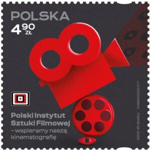 Issue date: 08-12-2025 …  A unique postage stamp issue created to celebrate the 20th anniversary of the Polish Film Institute is a tribute to Polish cinematography and its rich tradition. The design combines the classic aesthetics of Polish film posters with a modern digital style, creating a composition that reflects the expression and dynamism of Polish cinema. The issue was developed in close cooperation with the applicant – the Polish Film Institute. All graphic materials used in the design come from the Institute. The project was created by Justyna Chodkowska, an employee of the Institute, and then adapted to PWPW requirements by Agnieszka Sancewicz. On the stamp: a graphic designed for the 20th anniversary of the Polish Film Institute, referencing the tradition of Polish film posters and reinterpreting it in a modern, digital form. The central motif of a stylized camera symbolizes film art as a meeting point of technology and emotion, image and imagination.