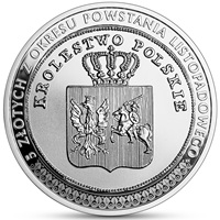 Despite the outbreak of the uprising, the mint initially continued to strike coins using the old stamps. The change did not take place until after the dethronement of Nicholas I on 25 January 1831. As early as on 10 February, the mint was ordered to remove the tsar’s portrait from the dies and replace it with a new coat of arms of the Kingdom, depicting the Eagle and the Chase on a divided, crowned escutcheon. Copper 3-grosz (trojak) coins, billon 10-grosz coins, silver 2-złoty and 5-złoty coins, and gold ducats of the Dutch type were struck with this new emblem. A total of 7.5 million coins of all types were minted. A 5-złoty coin representing the insurgent currency was chosen as the theme for the new collector coin. Its obverse features the aforementioned coat of arms with the Eagle and the Chase. The inscription along the rim above clearly indicates that it symbolises the Kingdom of Poland. The reverse shows the denomination in the centre: 5 / ZŁOT· / POL·. This inscription is surrounded by a wreath of oak leaves. At the bottom of the wreath there are two letters: K· and G·, which are the initials of the mint’s administrator, Karol Gronau. Along the rim, the exact coinage standard of the 5-złoty coin and the date: 17 211/625 Z GRZYW·CZYST·KOL· * ROKU 1831 * are featured.