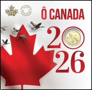 Look up at the sky—designed by Canadian artist Tony Bianco, the $1 coin in the 2026 O Canada Gift Card Set features a patriotic flyby backed by a maple leaf, with five Canada geese positioned in the flying V-formation that is a familiar sight in our skies each spring and fall, during the species’ migratory flights. The obverse features the effigy of His Majesty King Charles III by Canadian artist Steven Rosati.