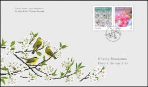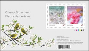 About the design … These stamps feature original photographs of the cherry blossoms, taken at the Nitobe Memorial Garden at the University of British Columbia Vancouver. Photographed by Brett Hitchins and designed by Belisle Creative. The front cover features the image from the Prunus ‘Somei-yoshino’ stamp and a close-up of one of the envelope seals. The booklet includes 10 envelope seals featuring illustrations of the Wilson’s warbler – a frequent visitor to Vancouver’s cherry trees in springtime – illustrated by Jenny Liski. Stamp Designer: Belisle Creative; Quantity Produced: 600,000; Issue Date: March 2, 2026.