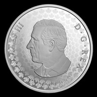Designed by artist Claudio D’Angelo, the reverse design features a naturalistic sprig of maple leaves swaying in the breeze. Two of the maple leaves are engraved, while the middle leaf is bejewelled adornment cast in .925 sterling silver with 24-karat gold plating and dotted with nine round brilliant cut diamonds (tcw 0.15). The obverse features laser-engraved maple leaves that form concentric rings behind the effigy of His Majesty King Charles III by Canadian artist Steven Rosati.
