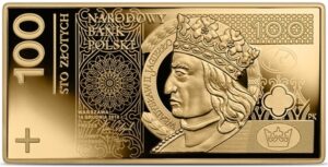 In 2023, Narodowy Bank Polski inaugurated the series of gold collector coins “Banknotes in Circulation in Poland” struck with proof finish. The gold collector coin with a face value of 100 złoty, featuring a stylised image of a contemporary circulation banknote with a face value of 100 złoty, was issued as the fourth coin of the series. On the reverse, in the central part, a portrait of King Ladislas II Jagiello can be seen in a decorative medallion. A stylised rosette and elements of Gothic ornamentation are depicted in the background of the inscriptions. On the right of the portrait, there is an oval with fragments of a crown and below the oval, against the background of a Gothic ornament, a rosette. An ornament with a crown is placed underneath. In the centre of the obverse, there is a stylised image of an escutcheon with the eagle from the tombstone of King Ladislas Jagiello, with a Teutonic knight’s helmet and cloak, as well as two swords laid at its bottom. On the left of the escutcheon, there is an outline of the Castle of the Teutonic Order in Malbork, and above it, an oval with fragments of a crown.