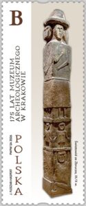 Issue date: 18-02-2026 … The issue celebrates the 175th anniversary of the Archaeological Museum in Kraków, the oldest archaeological museum in Poland. The institution was founded as the Museum of Antiquities by Kraków’s intellectual community associated with the Kraków Scientific Society. The stamp presents the Światowid (Zbruch Idol)—a four‑sided limestone sculpture from the Miodobory region, preserved at a height of 257 cm and usually dated to the 10th century or the late 9th/10th century. The image shows the figure with great detail, emphasizing its unique iconography and cultural significance.The accompanying stamp sheet includes multiple representations of the sculpture along with archaeological artefacts from the museum’s collection, such as tools, blades and other ancient objects. The FDC envelope contains a panoramic photograph of Kraków, with the museum buildings and its garden clearly visible in the foreground. The postmark presents the simplified, stylized head of the Światowid—the official emblem of the Archaeological Museum in Kraków.