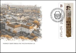 W polu ilustracyjnym koperty FDC umieszczono panoramiczną fotografię Krakowa, ukazującą m.in. zabytkowe zabudowania w centrum miasta. Na pierwszym planie widoczne są budynki Muzeum Archeologicznego i ogród muzealny, stanowiące integralną i rozpoznawalną część tej historycznej instytucji. Fotografia została utrzymana w eleganckiej, stonowanej stylistyce, dobrze korespondującej z archeologicznym charakterem emisji. Datownik to uproszczona, schematyczna grafika przedstawiająca głowę posągu Światowida, będącą jednocześnie logotypem Muzeum Archeologicznego w Krakowie. Całość utrzymano w klarownej, minimalistycznej formie, która dobrze współgra z charakterem jubileuszowej emisji. Oznaczenie literowe B odpowiada wartości nominalnej znaczka używanego do uiszczenia opłaty za priorytetową przesyłkę listową nierejestrowaną w obrocie krajowym w formacie S.